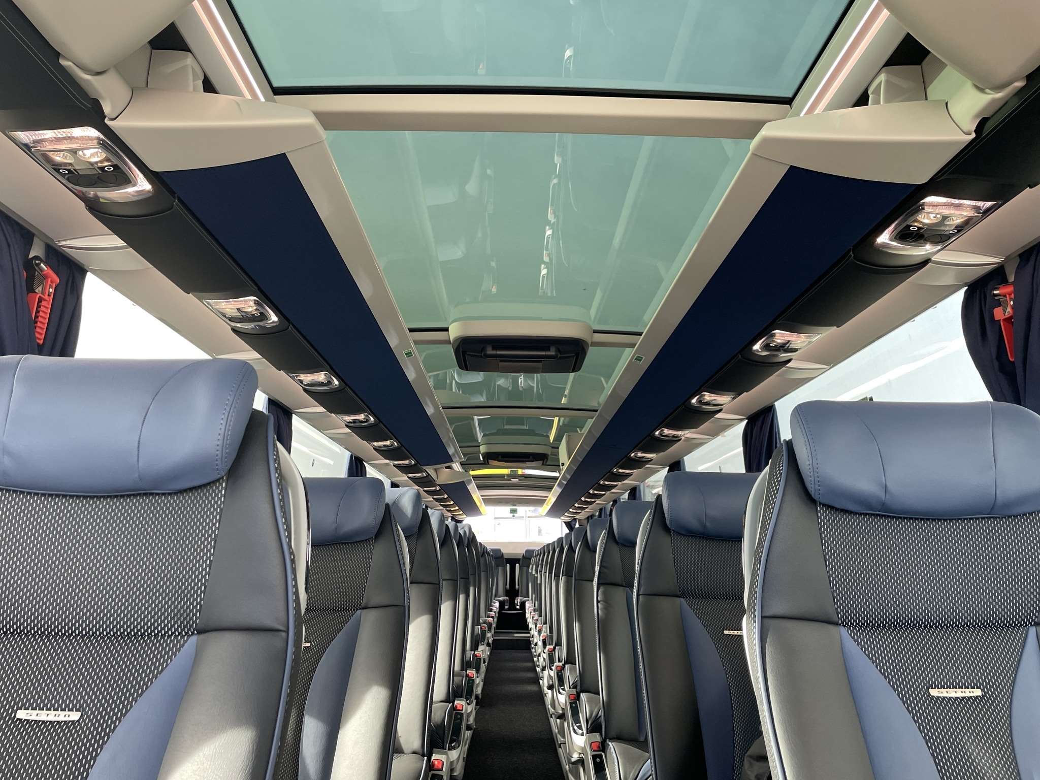 Vores nye SETRA S517 HDH TopClass er udstyret med forskudte stole med justerbare nakkestøtter, 220 V stik ud for hver stolerække og et stort panorama glastag. Kæmpe tak til Hessel Bus A/S, der har leveret begge vores nye SETRA S517 HDH TopClass-turistbusser.